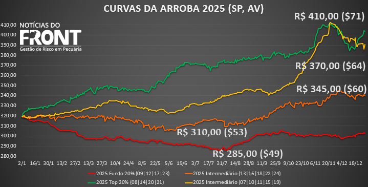 Com base no valor da arroba do início de janeiro e nos caminhos que ela percorreu no passado, quais poderão ser, e quando poderão ocorrer, o fundo de safra e o teto da entressafra para o boi gordo em 2025?